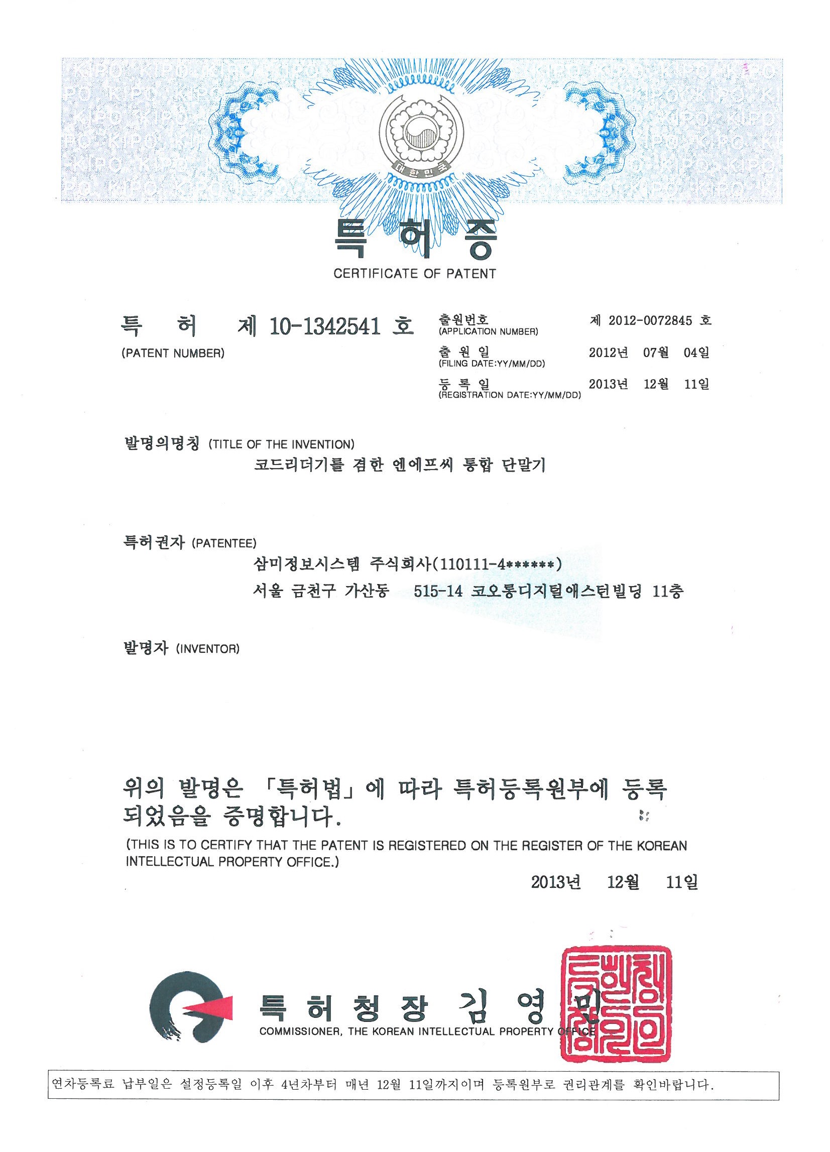 HOME > 제품소개 > H/W > 보유특허 > 특허(4건)