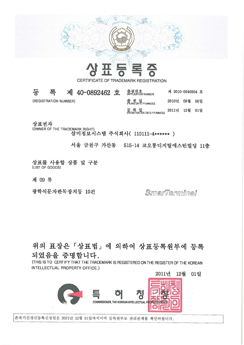 HOME > 제품소개 > H/W > 보유특허 > 상표(5건)